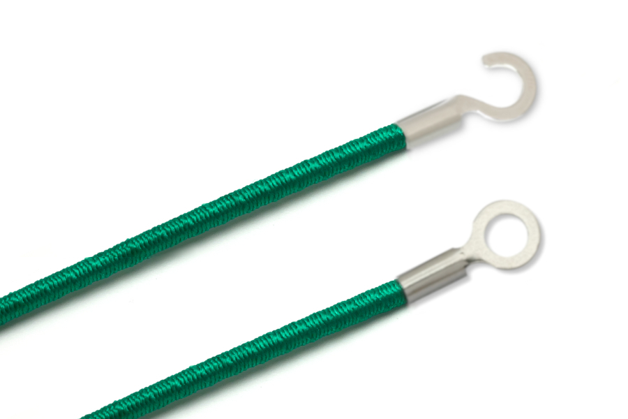 Gummischnüre mit Kabelschuhen, geschlossen und offen, dunkelgrün